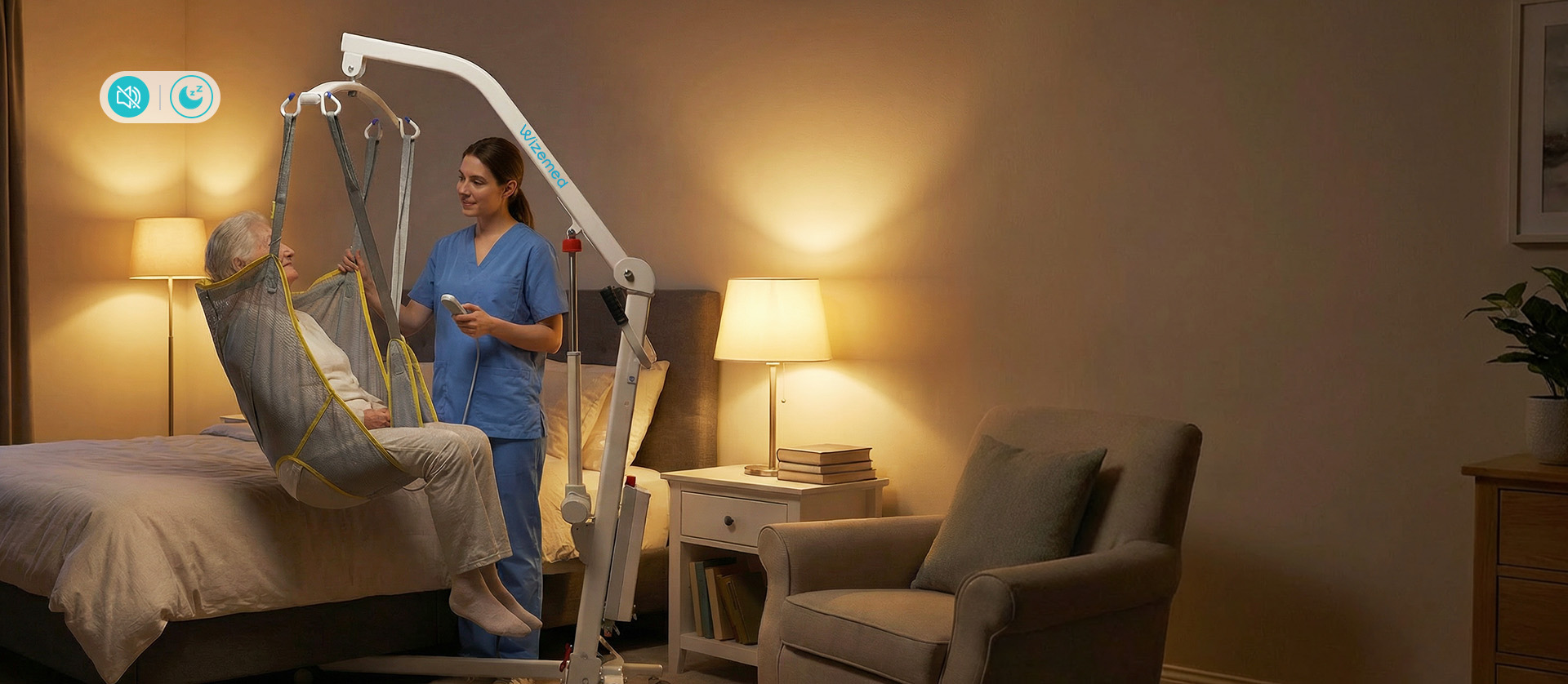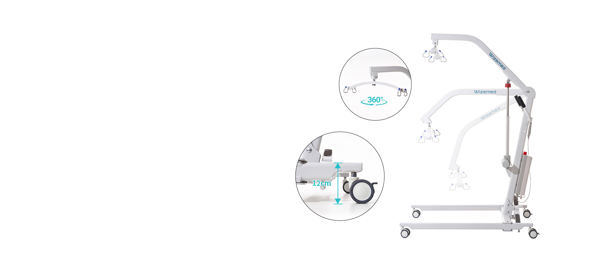 The Wizemed PL301 is a compact stand-assist lifter designed to support safe standing and seating transfers in home care, rehabilitation, and long-term care settings. It provides smooth, efficient assistance for both users and caregivers, with an optional rehabilitation support handle for added stability during early mobility and standing training. Multiple lifting and straddle options allow easy positioning, while the 360° rotating hanger bar ensures comfortable adjustment. With a 4.7'' floor clearance, the PL301 moves easily under beds and through narrow spaces. Medical-grade silent operation reduces disturbance, and integrated safety features—including an emergency stop and manual emergency descent—ensure reliable, user-friendly performance for everyday care.
