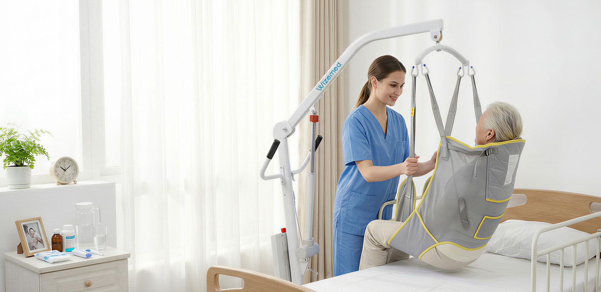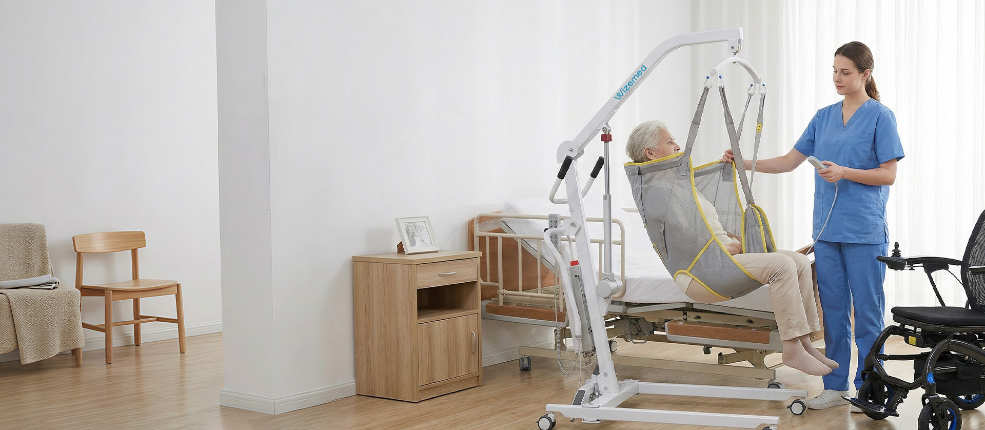 The Wizemed PL301 is a compact stand-assist lifter designed to support safe standing and seating transfers in home care, rehabilitation, and long-term care settings. It provides smooth, efficient assistance for both users and caregivers, with an optional rehabilitation support handle for added stability during early mobility and standing training. Multiple lifting and straddle options allow easy positioning, while the 360° rotating hanger bar ensures comfortable adjustment. With a 4.7'' floor clearance, the PL301 moves easily under beds and through narrow spaces. Medical-grade silent operation reduces disturbance, and integrated safety features—including an emergency stop and manual emergency descent—ensure reliable, user-friendly performance for everyday care.
