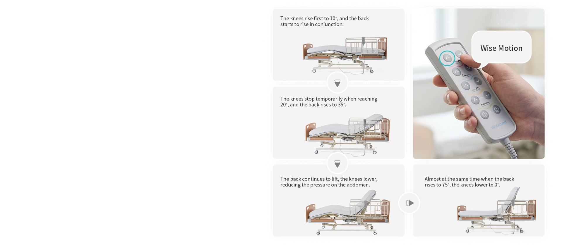 Back lift, leg bend, back–knee linkage, and overall lift powered by Timotion medical-grade actuators, ensuring smooth, precise adjustments.